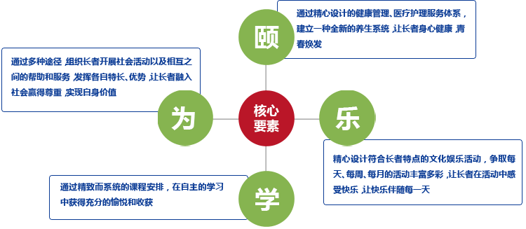 “学院式养老模式”的核心要素是“颐乐学院”,即以学院式的组织方式,构成园区内老年人的日常生活形态,开展适合老年人身心健康的各类活动。